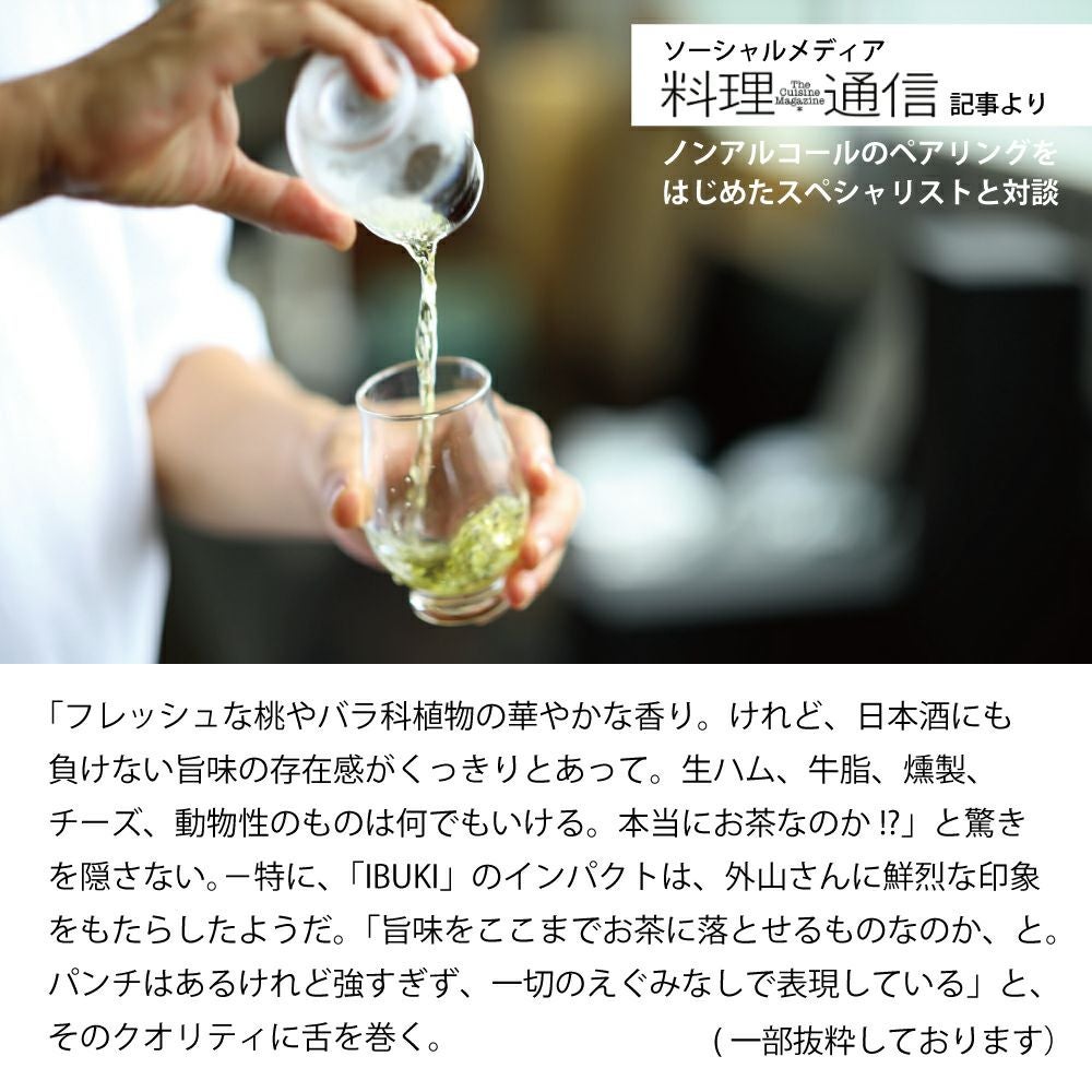 ブランド名にもなっている「IBUKI」は、当社の茶園にて20年以上の歳月をかけ開発された茶品種「金谷いぶき」を使用。濃緑で艶のある色沢と剣先のように細く整った形状をしています。香気は出汁のような濃厚かつ華やかなうまみを感じることができます。